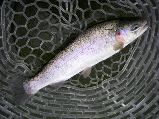 ◆そんなこんなで退却予定の16時を廻り、ry親子に撤退を告げ、最後に身障者エリアで頑張るD君氏横へと移動。◆本日の釣果を尋ねると計5匹(?)と仰った。この渋い状況でなかなかの腕前と見た!タックルも良い物をお使いのようだし、来シーズンは是非とも渓流デビューを飾ってくださいませ・・・今日のここよりイージーだから(笑) ◆最後にD君氏に断って、このポイントで最良と思われる放水口の落ち込みを狙わして頂く。 ラパラF5(S)を波紋の中へ通すと一発でHIT!虹鱒かと思われたが、近くまで寄せると見慣れぬ体色。はて?魚種はなんじゃ?と慎重を期してD君氏にネットで掬って頂くと、今度もジャガーだった。 ◆最後の最後に1匹釣れて、満足!満足(笑)良い気分で帰途に付きましたとさ♪ |