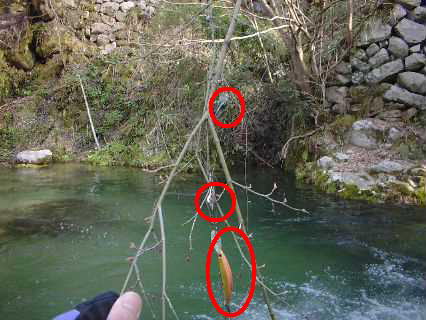 ・・・この淵も釣れなかった。。。3連続丸ボ街道爆進中じゃ(涙) 前方の淵に被さる木の枝を良く見ると何やらぶら下がっている。 股下まで浸かりながら枝を手繰り寄せて見事キャッチ!